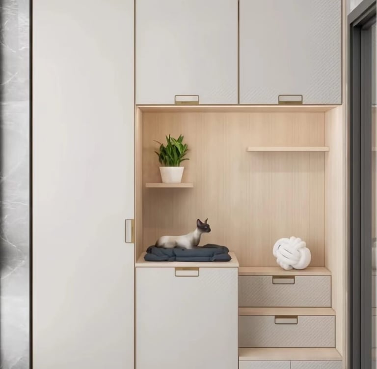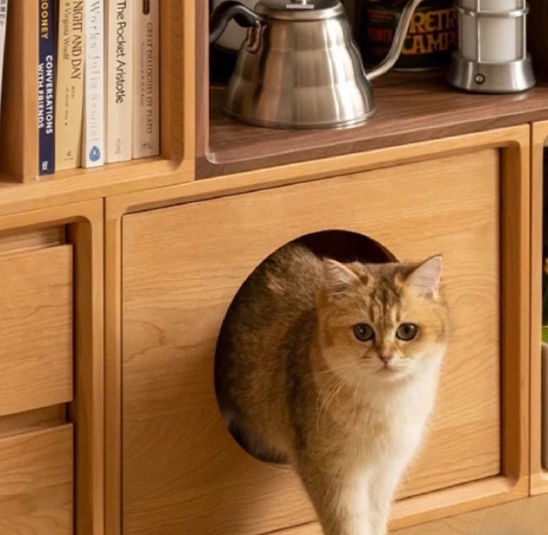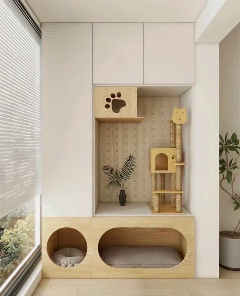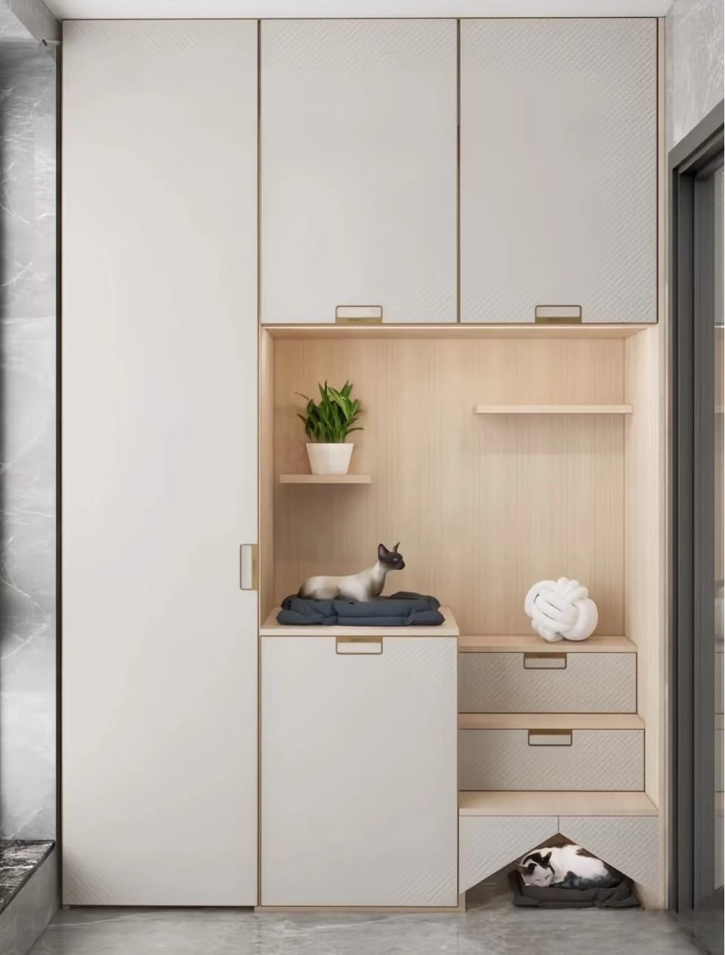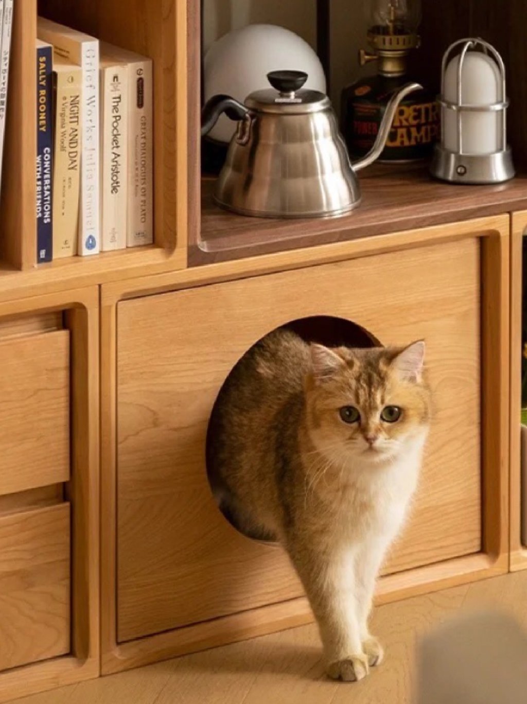 If you want to provide a unique and practical space for your cats, a specially designed cat cabinet is a perfect choice. This cabinet can store cat food, toys, and other items, and also serve as a resting area for your cats. Leave a small hole on the top of the cabinet that connects to a warm, soft cushion for your cats to lie down and observe the indoor activities. Inside the cabinet, you can set adjustable shelves to place cat beds, toys, and litter boxes as needed. Additionally, you can add a small transparent window on the side of the cabinet, allowing your cats to peek outside while enjoying a sense of security.
