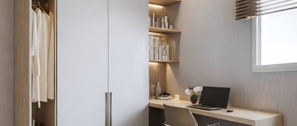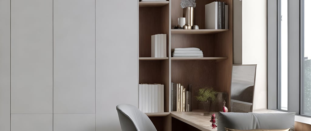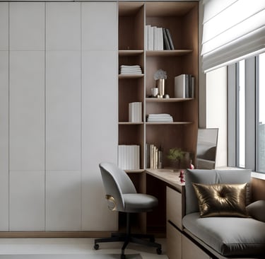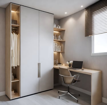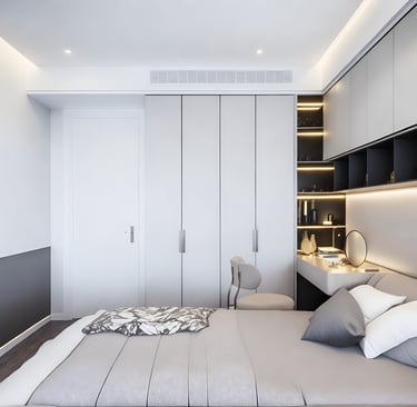 Combining Bedroom and Study or Dressing Area: In contemporary design, multifunctional spaces are highly valued. Integrate a study area or dressing zone seamlessly into the bedroom layout. For a study area, consider a sleek, minimal desk that complements the bedroom decor. Ensure that it is positioned to benefit from natural light and doesn’t encroach on the resting area. For a dressing area, use built-in wardrobes with mirrored doors or sliding panels that blend with the room’s aesthetics while providing ample storage.