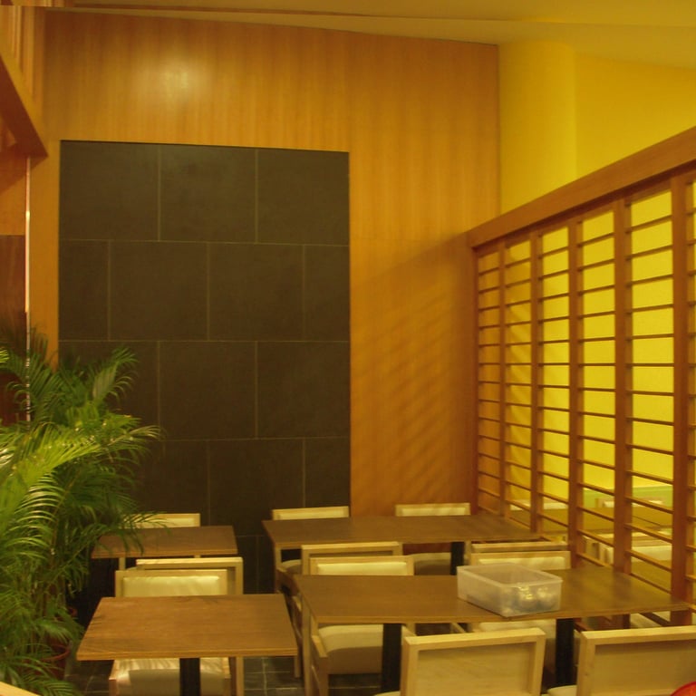 To enhance the tropical feel, the space features a thoughtful mix of textured finishes and artificial lighting, complemented by wooden furnishings and green accents. The Japanese design elements, like structured layouts and balanced proportions, add a calming influence. Our goal was to create an environment where guests feel at ease, surrounded by a harmonious blend of tradition and modernity.