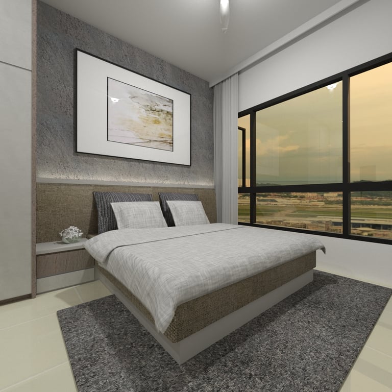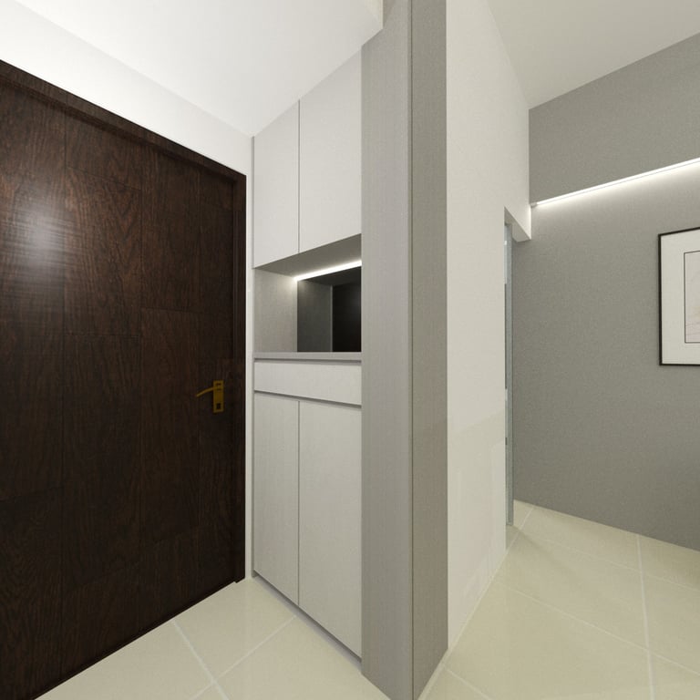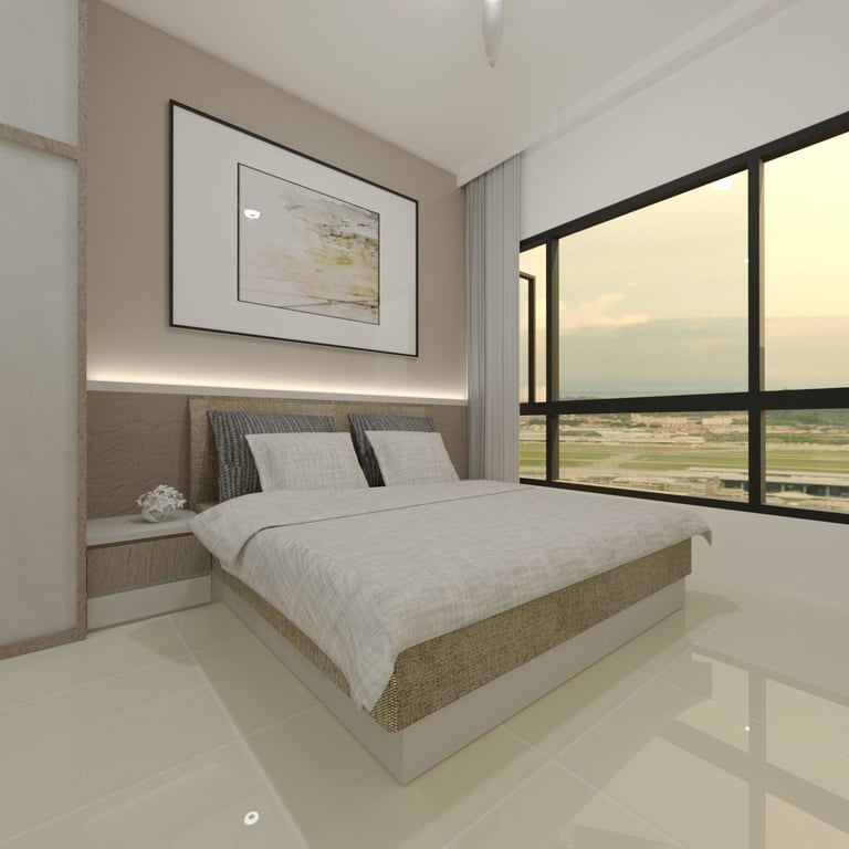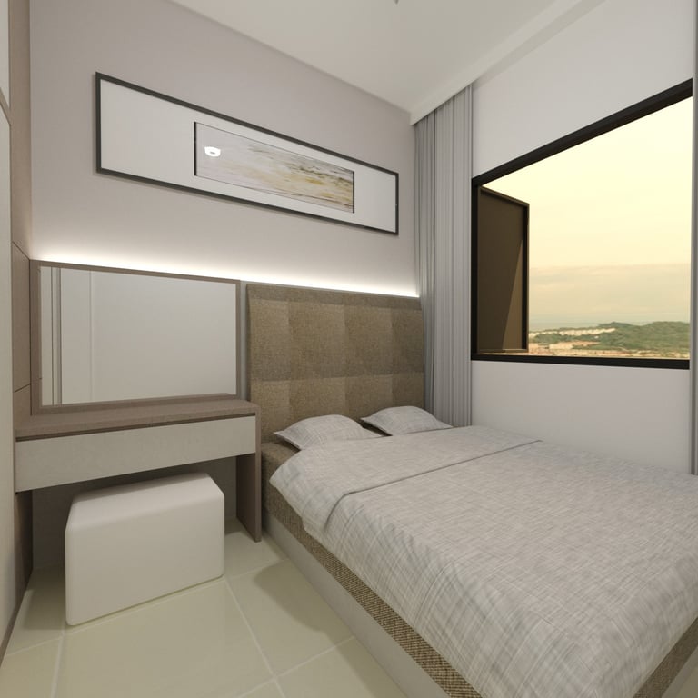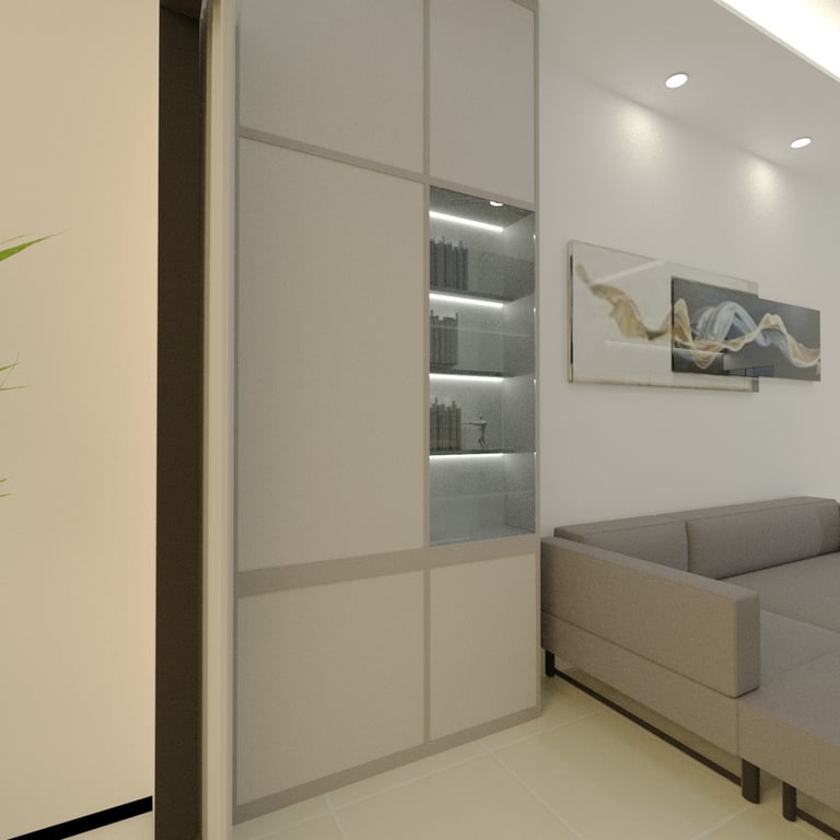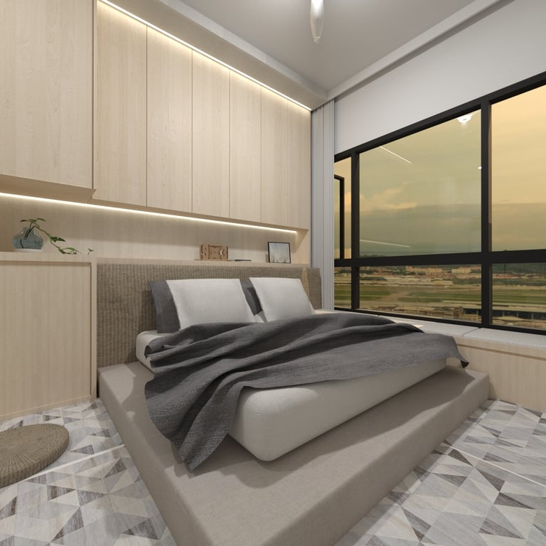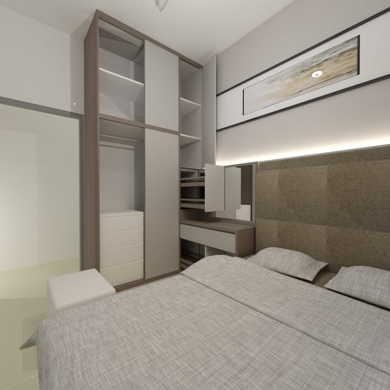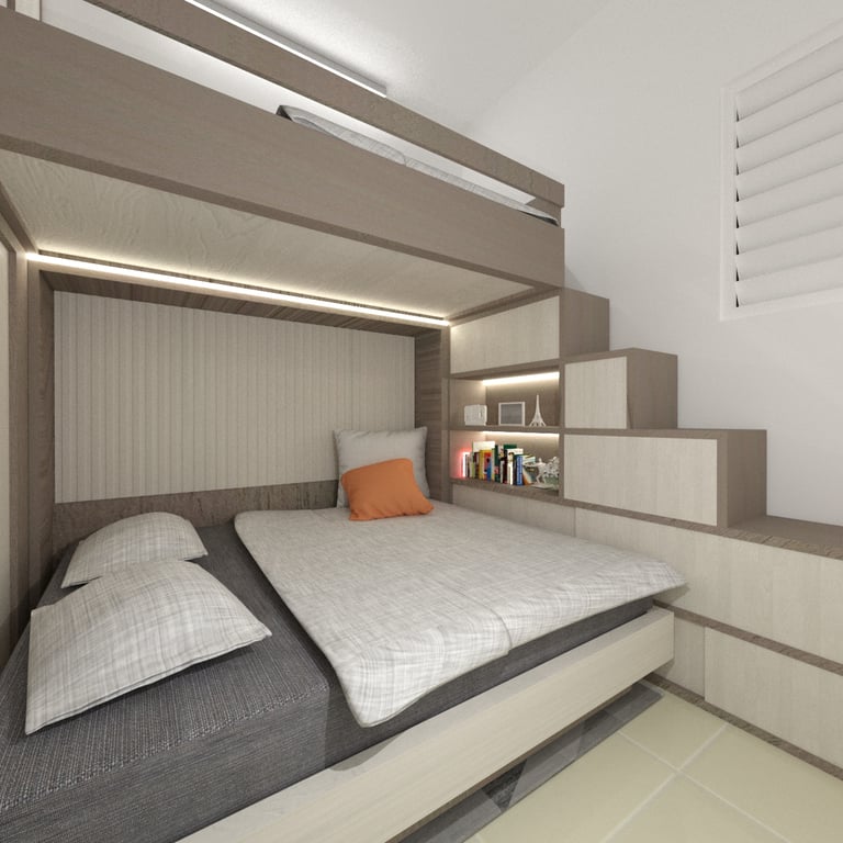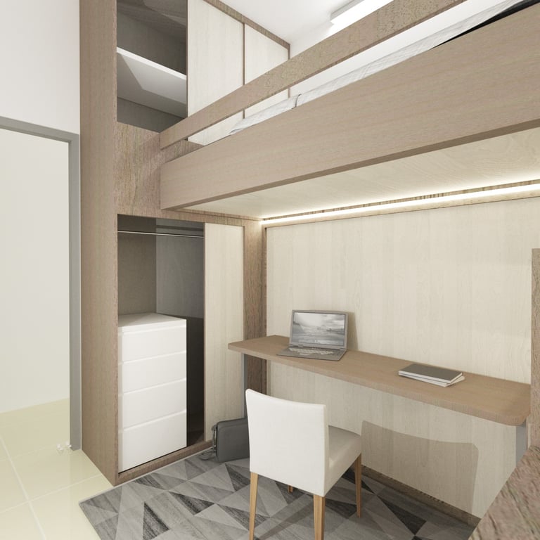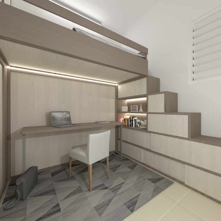 The combined study and bedroom area is designed with distinct zones that cater to both learning and relaxation. Custom-built desks and shelving units provide ample space for each child’s educational materials, while cozy beds and personal storage ensure restful nights and easy access to their belongings. The use of soft, neutral tones throughout the space creates a calming atmosphere, while vibrant accents add a touch of personality and inspiration.