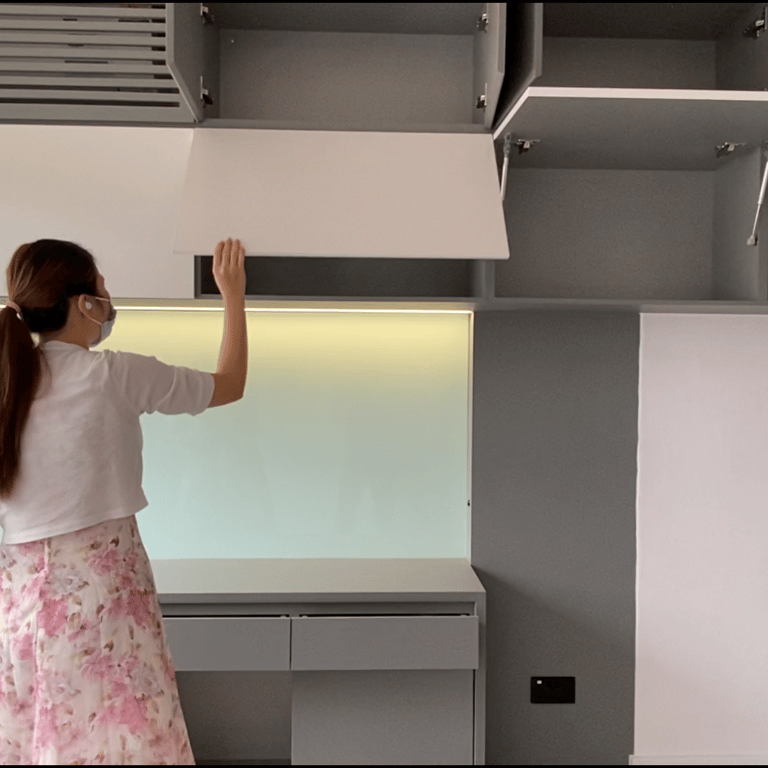 Bright pearl white and various shades of gray open up the compact living room, making it feel more spacious. Clean lines and a well-considered layout ensure that every element is stylish and functional. The minimalist principles reflected throughout the design keep the space uncluttered and enhance its overall comfort.