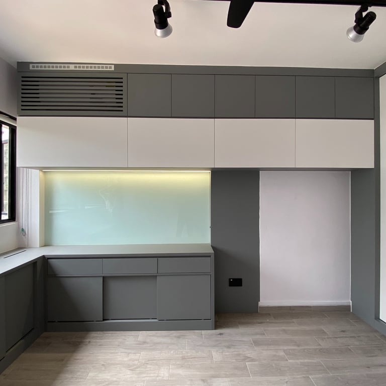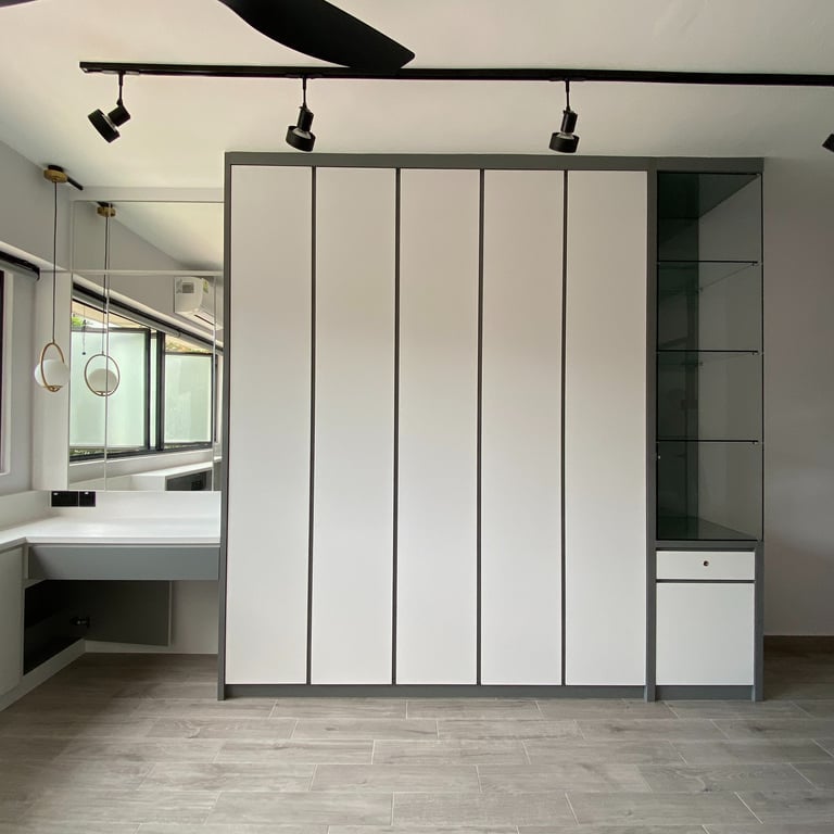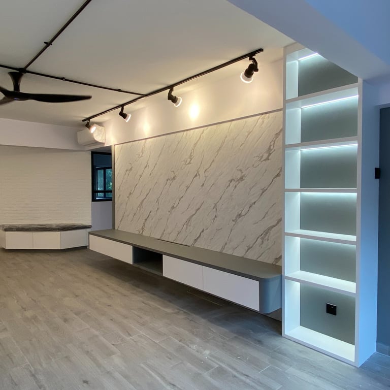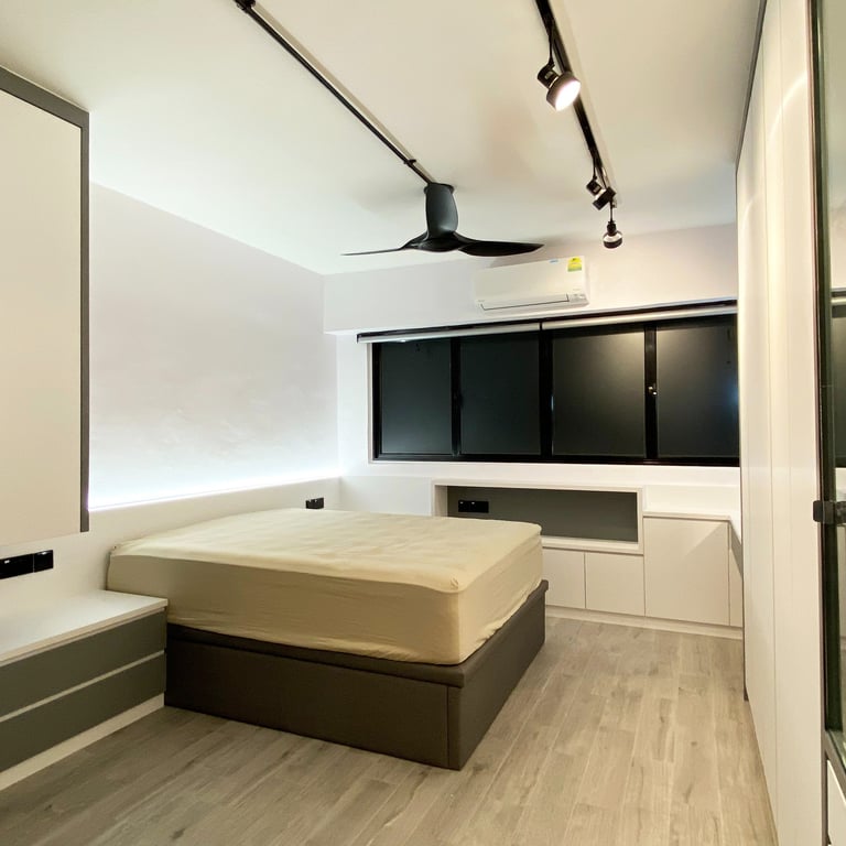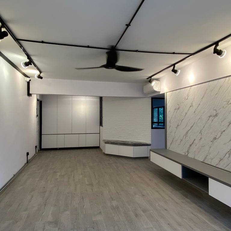 The design features a chic neutral palette of black, gray, and white, providing a versatile foundation that ensures a timeless and adaptable look. By incorporating dual-toned elements—such as the sofa, flooring, feature walls, and track lighting—we emphasize the industrial theme while maintaining a vibrant modern atmosphere.