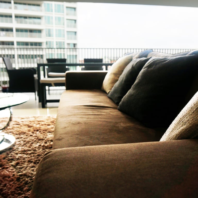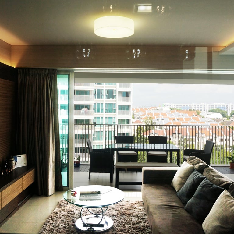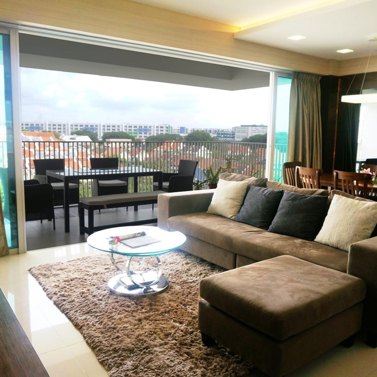 A continuous counter stretches from the living hall to the balcony, effectively extending the living area and creating a more spacious and comfortable environment. This thoughtful arrangement of furniture and design elements enhances both the functionality and the sense of openness in the condo.