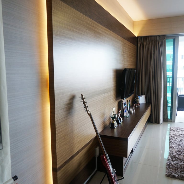 This project transforms a residential condo into a luxurious retreat reminiscent of a high-end hotel. By incorporating timber finishes, stylish wallpaper, and carefully curated furnishings, we have created a sophisticated living environment.