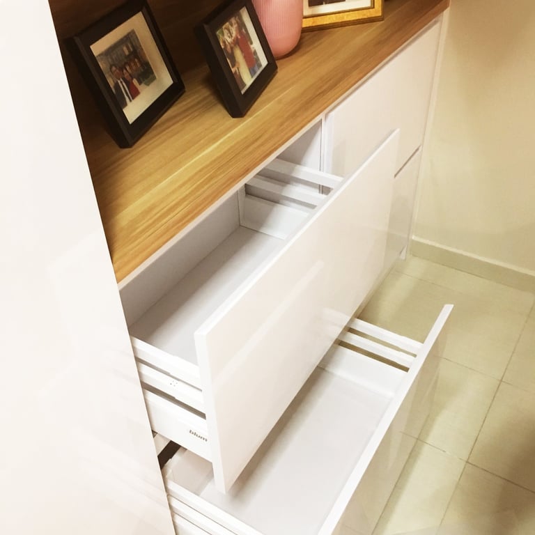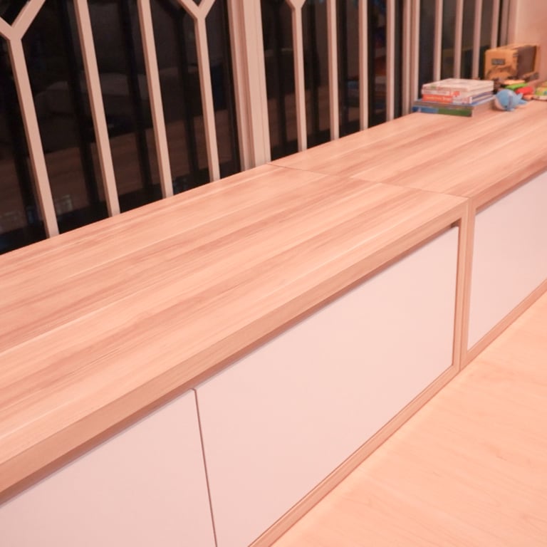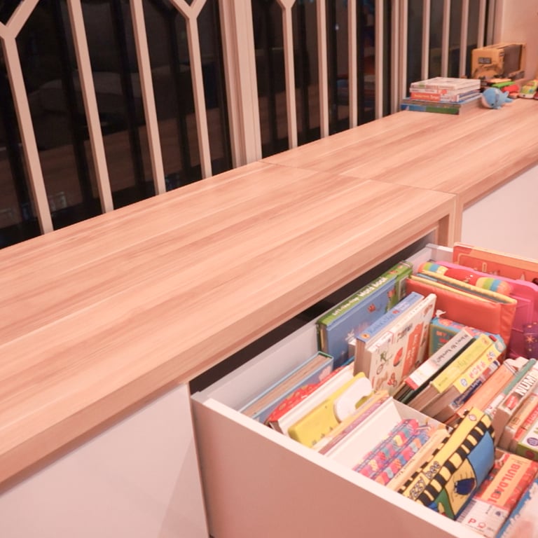 For toy organization, we integrated large custom drawers that combine storage and versatility. These drawers are easily accessible and double as additional seating, reducing the need for extra furniture and enhancing both functionality and visual appeal.