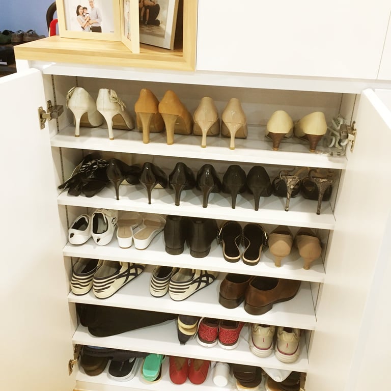 The entryway features a custom long shoe cabinet designed to accommodate the entire family’s footwear. This practical and stylish solution keeps the home organized from the moment you enter, offering ample storage and a welcoming first impression.