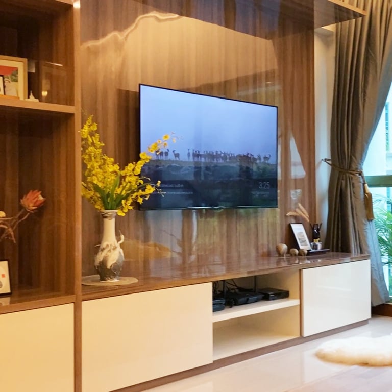 The elongated layout of the living area presented an opportunity to innovate. We strategically combined the storage cabinet and TV console into a single, continuous wall unit. This design maximizes space by integrating ample storage with a clean, modern aesthetic. The full-wall installation minimizes clutter while offering practical solutions for organizing everyday essentials, ensuring every corner is utilized effectively.